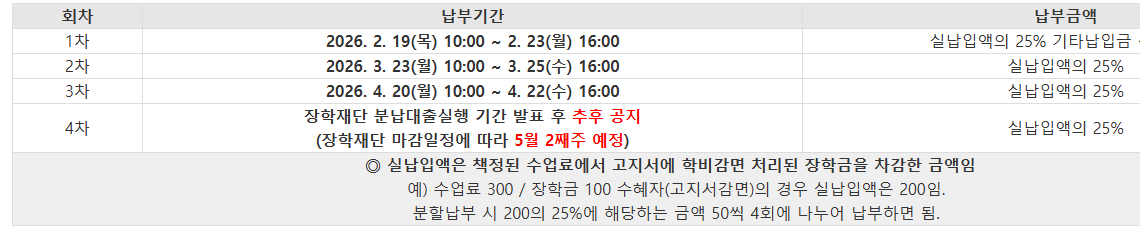 1. 재학생 분할납부 신청기간: 1차 - 2026. 2. 10.(화) 16:00 ~ 2. 12.(목) 16:00까지