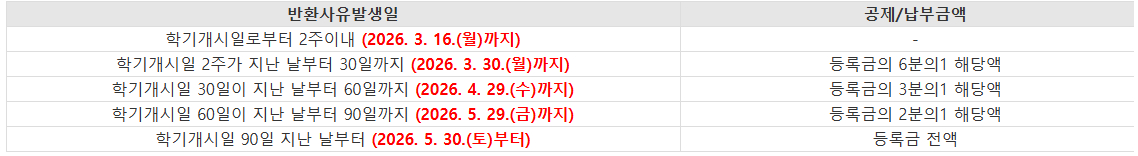 2. 2026-1 등록금 반환기준 안내(숙명여자대학교 학칙 별표 5의 등록금 반환 기준에 따름)